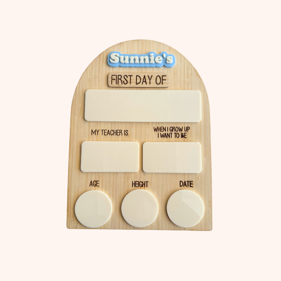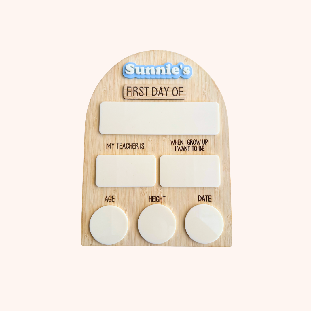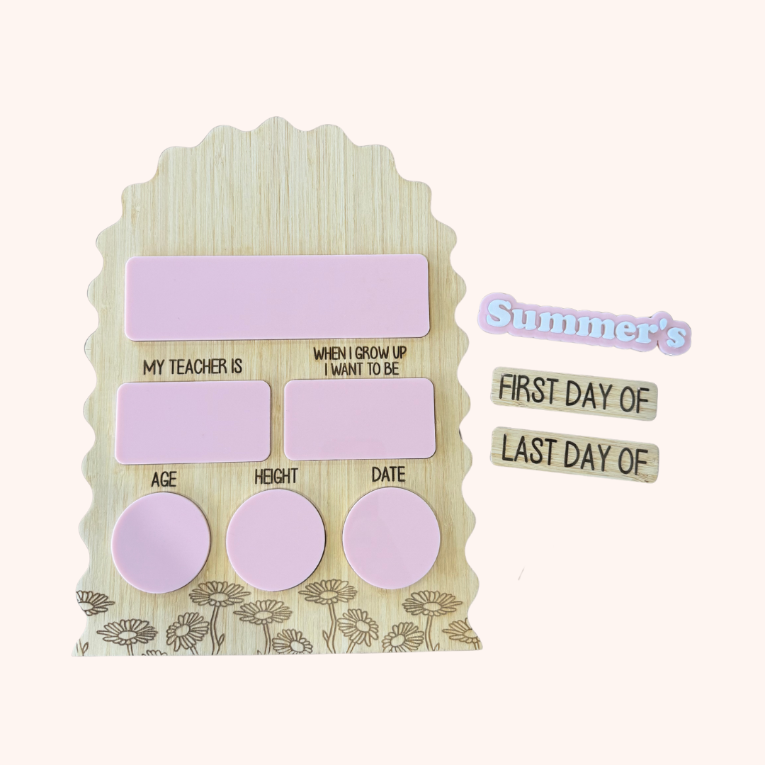 This bundle comes with a backing board, a swappable name, and tabs for marking both the first and last day.